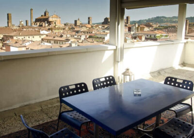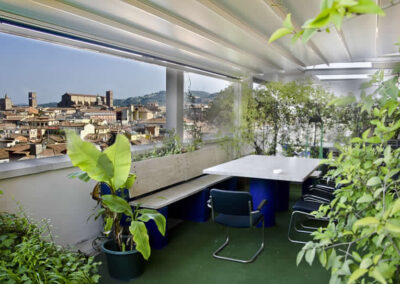 Bolognaoffice dispone di un ambiente di lavoro esclusivo, una sala riunioni con capienza di 8-10 persone, luminoso e finemente arredato con vista mozzafiato sulle due torri ed oltre 200 mq di un verdissimo terrazzo panoramico attrezzato con tendoni elettrici 6 m x4